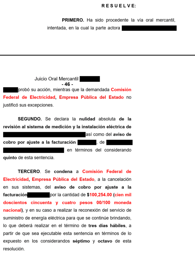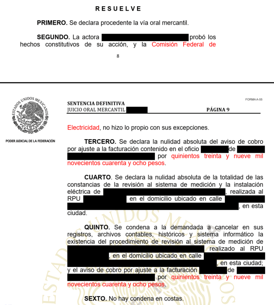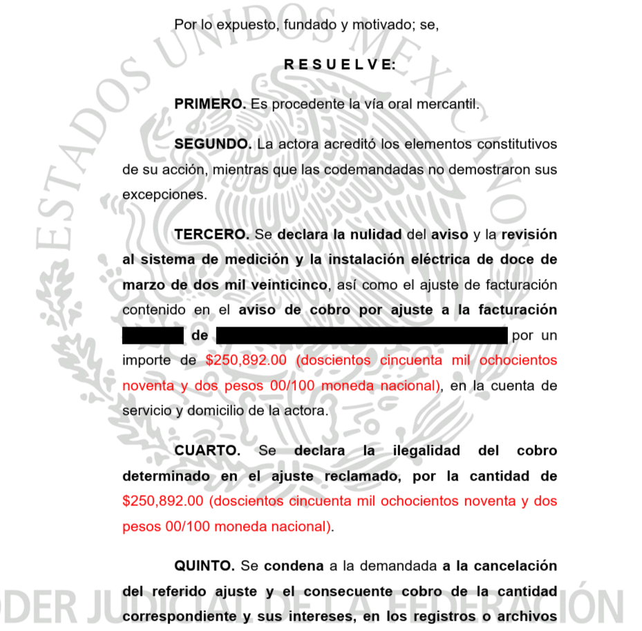 Un Juez de Distrito de la Ciudad de México declaró procedente la prescripción de las cantidades de $292,502.00 y $326,543.00 que indebidamente CFE pretendía cobrar.